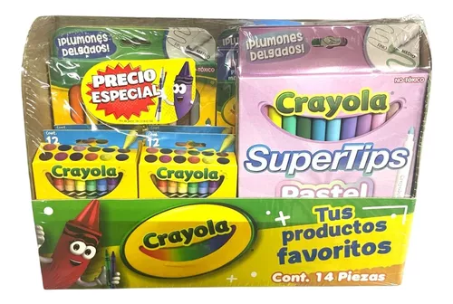 Contenido del empaque: • 4 paquetes de 12 crayones jumbo: tamaño ideal para manos pequeñas. • 7 paquetes de 12 plumones super tips: punta versátil para trazos finos y gruesos. • 3 paquetes de 12 plumones super tips pastel: colores suaves y elegantes. • 1 paquete con exhibidor de productos: práctico para mostrar y organizar en tu tienda.